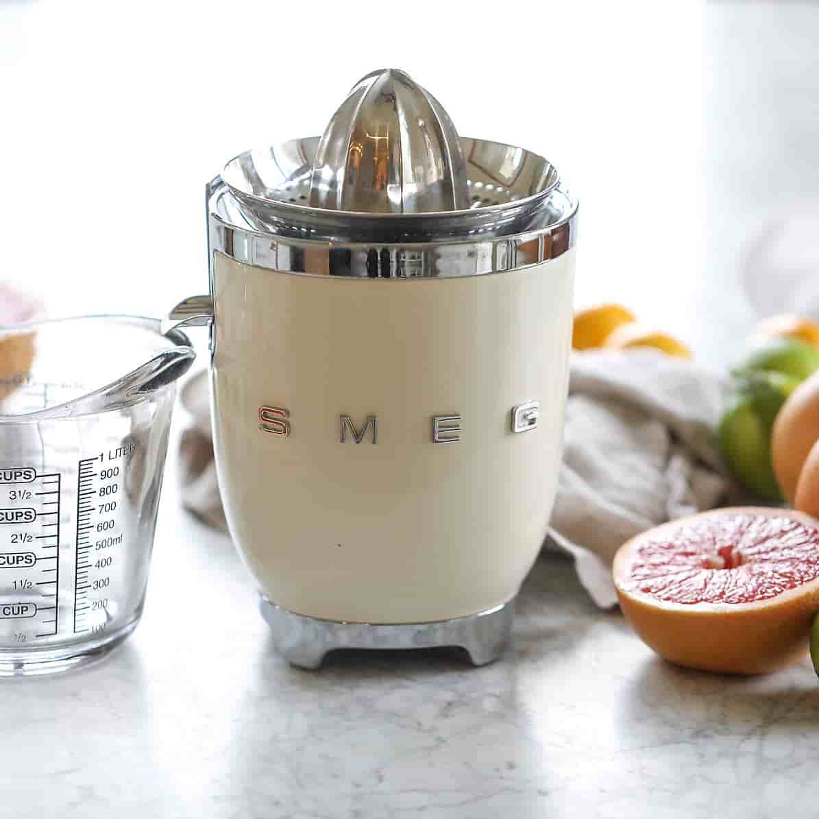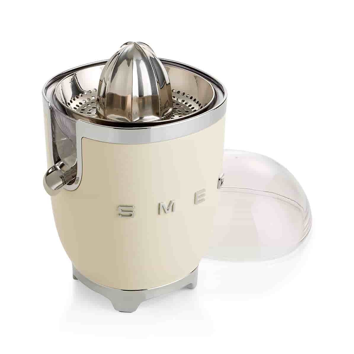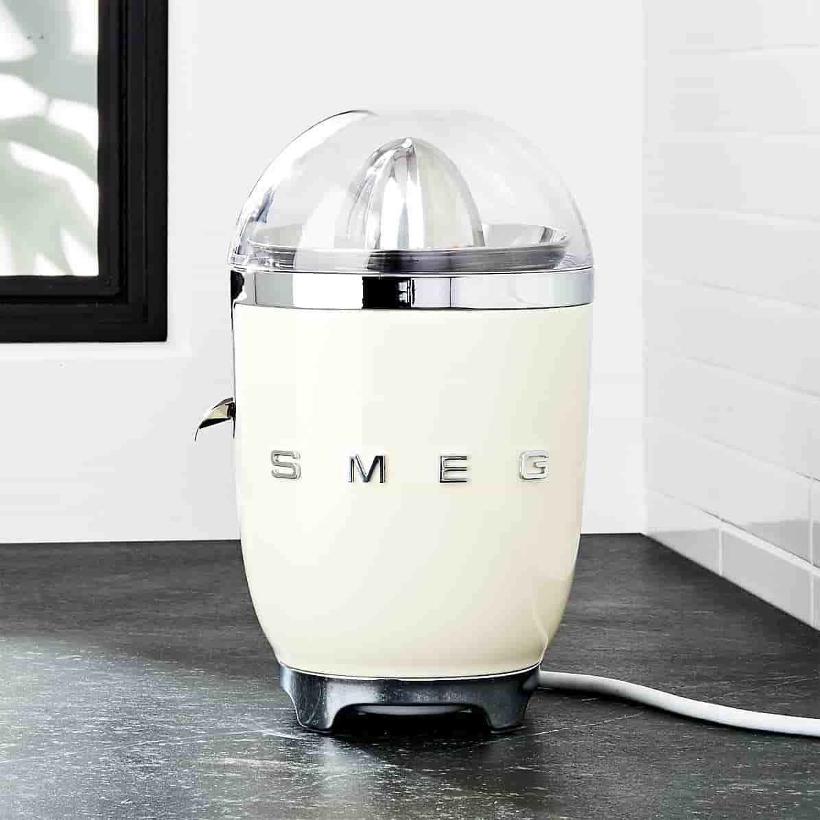 With its charming bullet shape and fun chrome metal accents, the cream-colored juicer effortlessly transforms oranges, grapefruit and lemons into tasty juice for sipping or recipes. Known for its wonderfully retro refrigerators, Smeg has launched a joyfully designed kitchen appliance collection based on the curved and compact lines of postwar design. Incorporating a 1950s-era aesthetic, Smeg’s nod to the past is the star of today’s kitchen, incorporating all the current advances in technology.