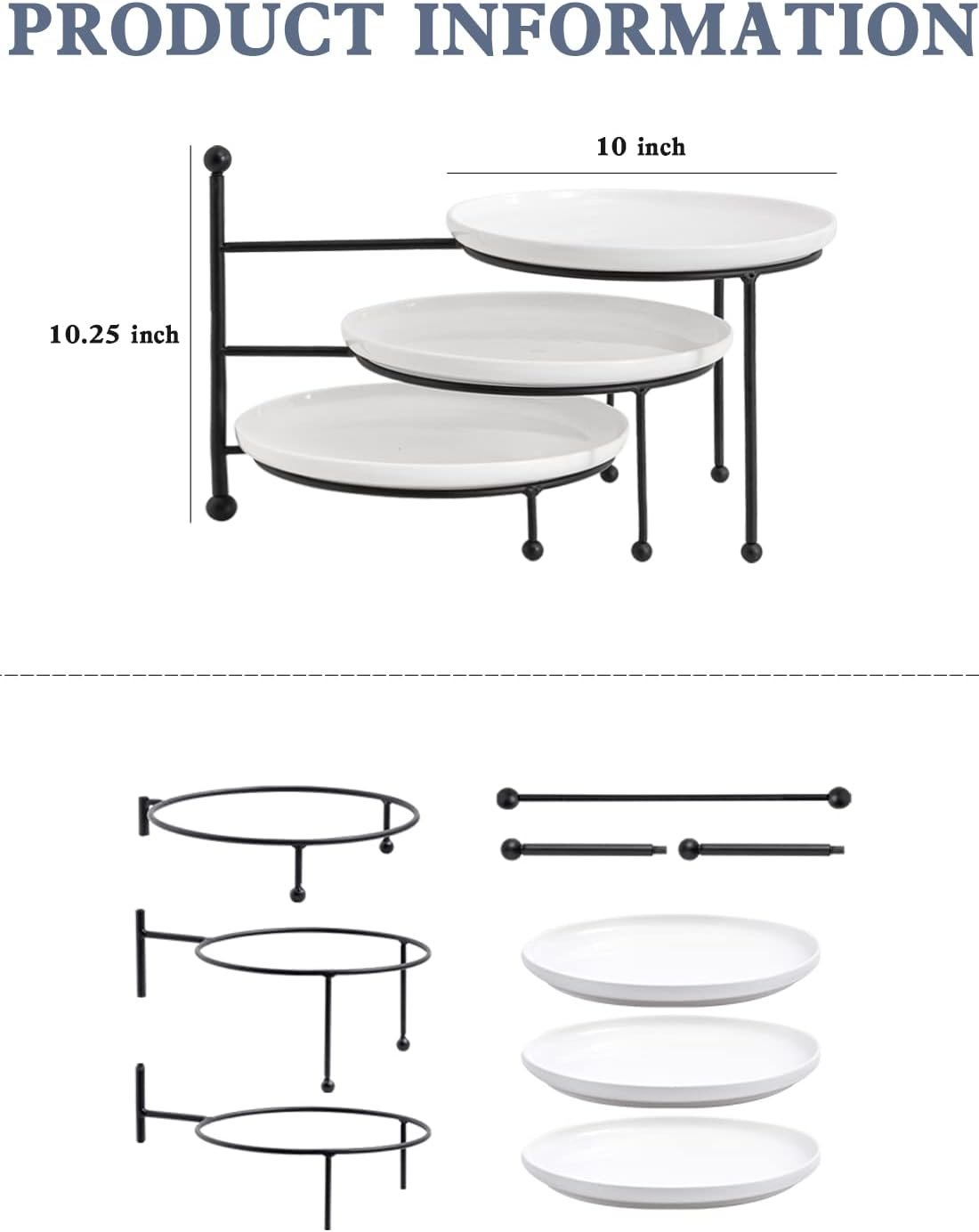 3 Tiered Serving Stand with White Porcelain Plates, 10 Inch Round Tray, Black Metal Stand, Versatile & Durable