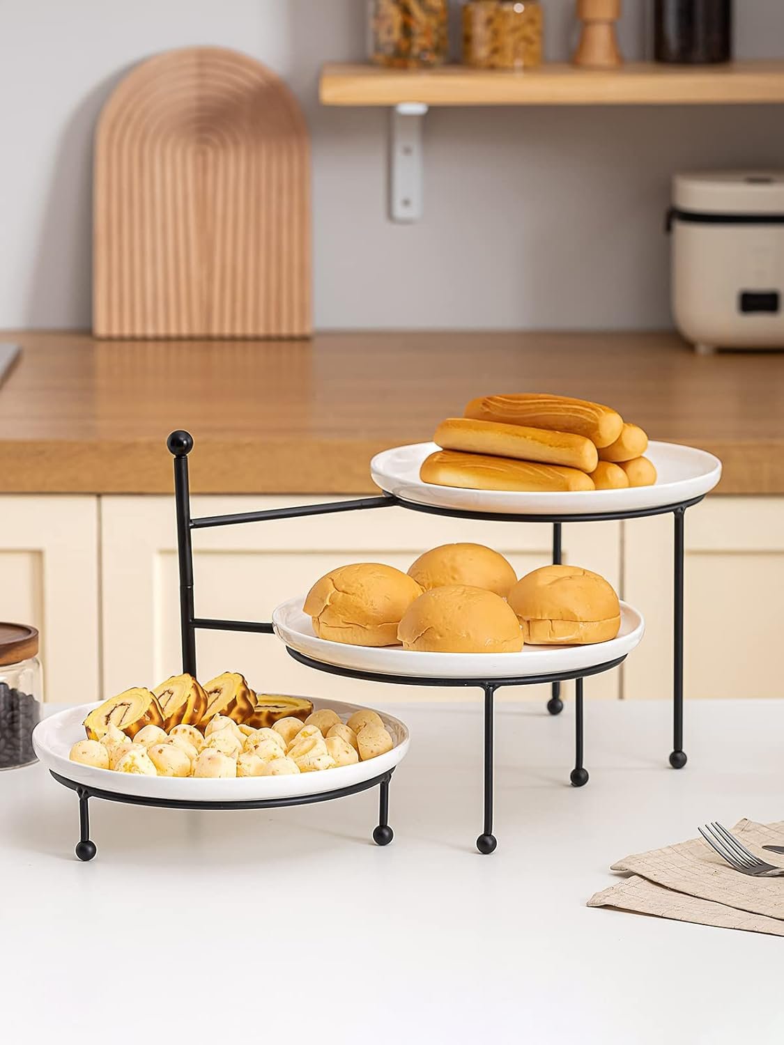 • Kanwone 3 Tiered Serving Stand with White Porcelain Plates, 10″ Round Tray, dessert table display set, Black Metal Stand, Versatile & Durable